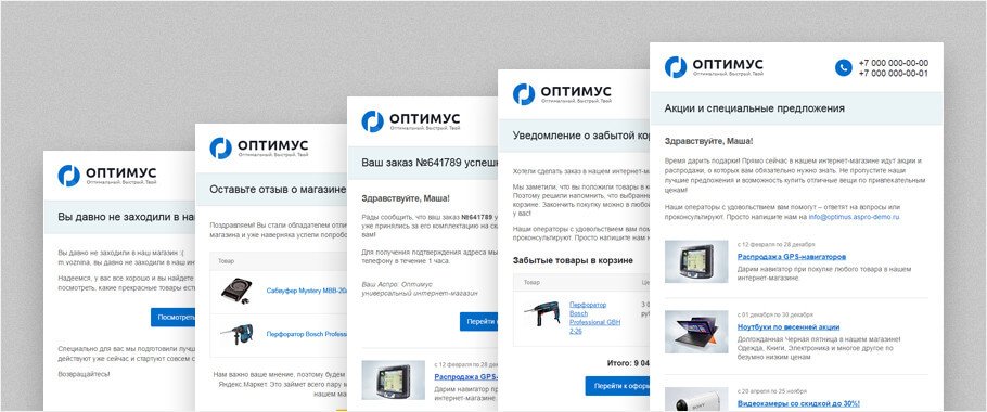 Correctly composed email conversations increase conversions by up to 30%. Thanks to the functionality of 1C-Bitrix, they can be launched in a couple of clicks, and new letter templates from Aspro will allow you not to think about design and layout.